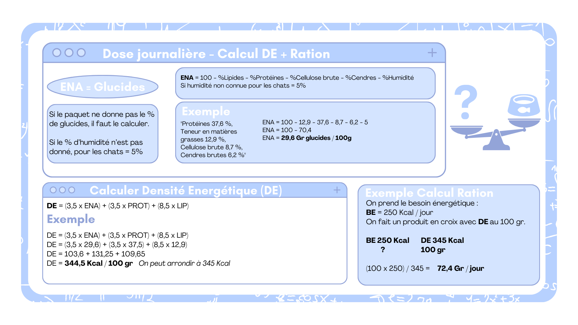 Pour calculer la dose journalière vous aurez besoin de calculer le Besoin énergétique de votre chat mais également de connaître les Kcal au 100 gr pour votre marque.